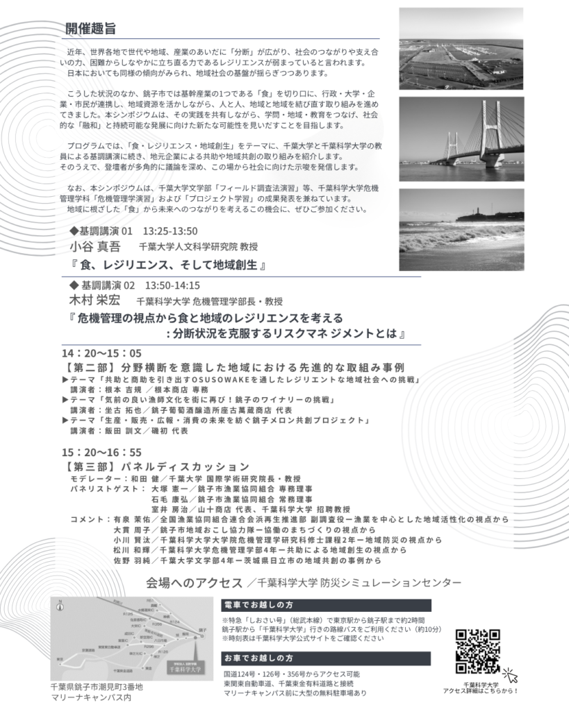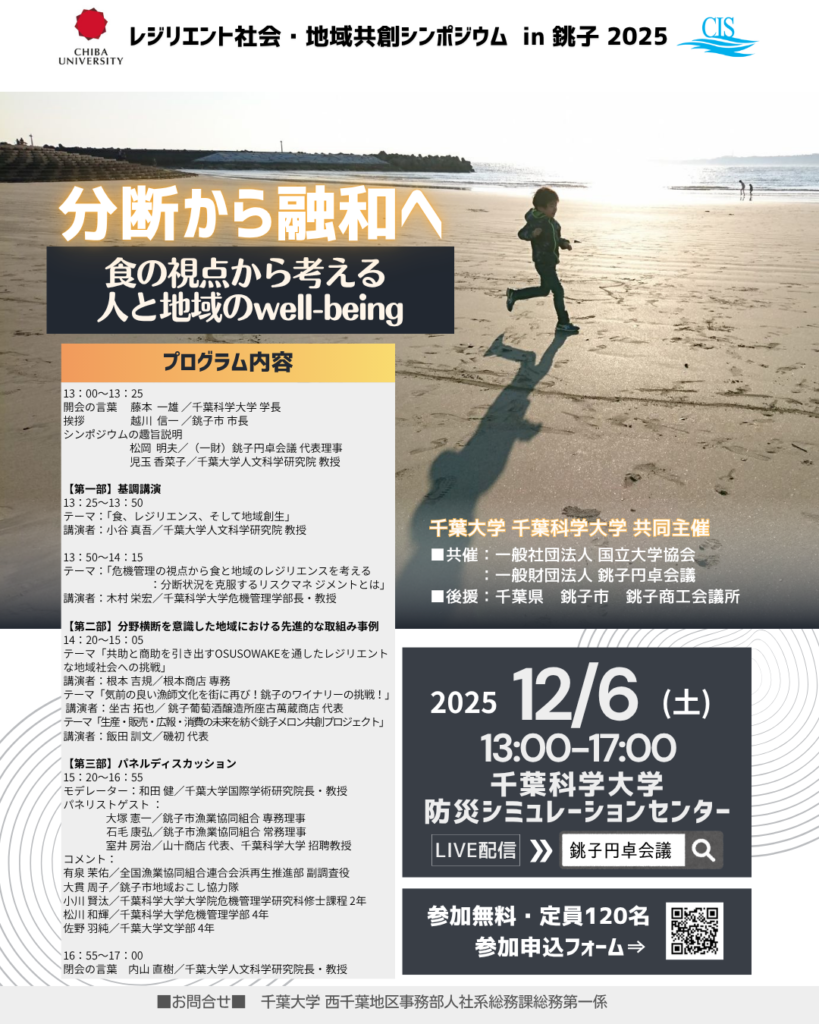 千葉大学、千葉科学大学が共同主催し、銚子円卓会議も共催しております『レジリエンス社会・地域共創シンポジウム in 銚子2025』では、会場並びにzoomによるオンライン配信のハイブリッド型で開催いたします。